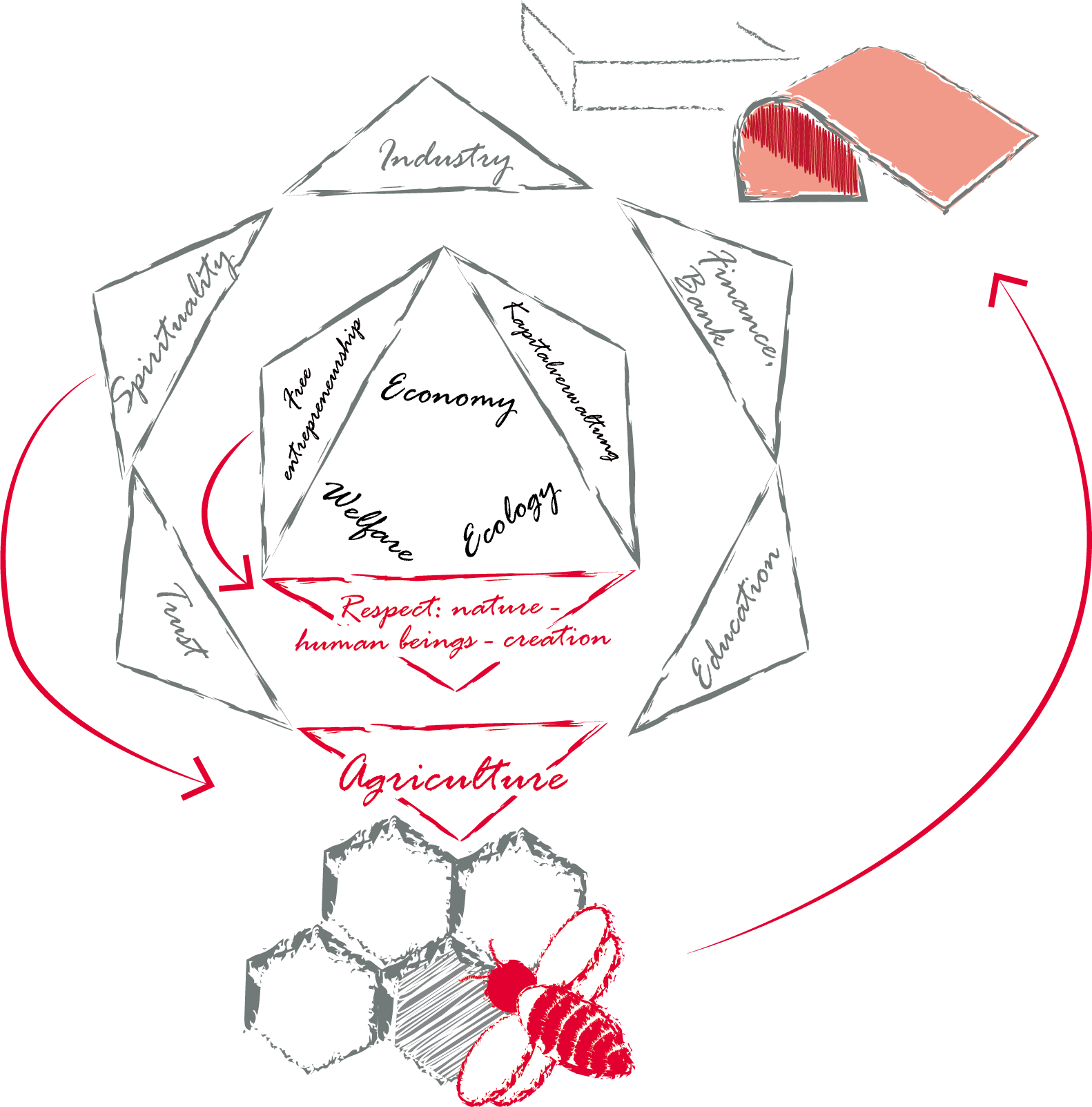 Economy is vitalized by a reasonable correlation of nature, labour, spirit and capital. Our spirit supports our further development and a vital being. The spirit is part of human nature in a holistic sense. A holistical way, which has been looked at as human threesome by Rudolf Steiner. It consists of eagle (element: air), lion (element: earth) and taurus or cow (living on the earth surface).