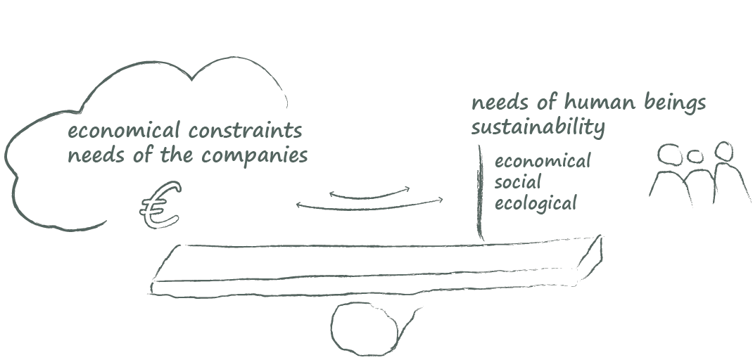 between economical constraints, needs of companies, needs of the involved human beings and sustainability.